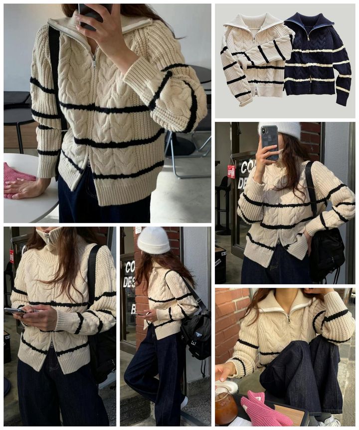 [韓國 雙向拉鍊橫條紋麻花上衣/外套]