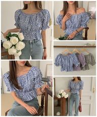 [韓國 春色繽紛蒲公英摺邊露肩上衣]