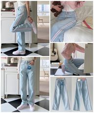 [韓國 繽紛側粉色雙槓直筒牛仔褲]
