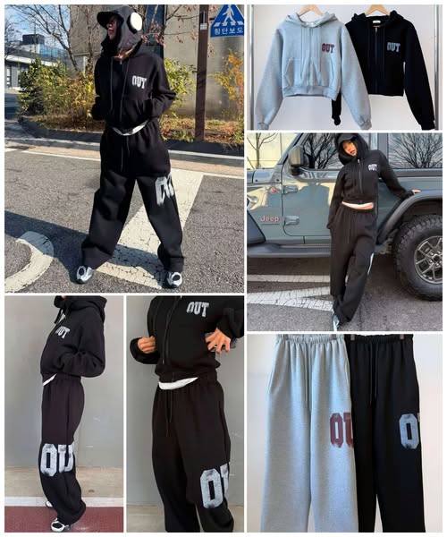 [韓國 雙色個性OUT印花帽外套+寬褲刷毛套裝]