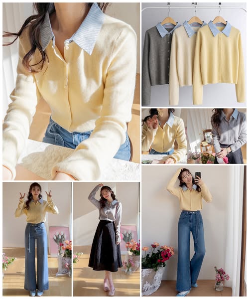 [韓國 溫柔系撞色襯衫領拼接針織開衫]