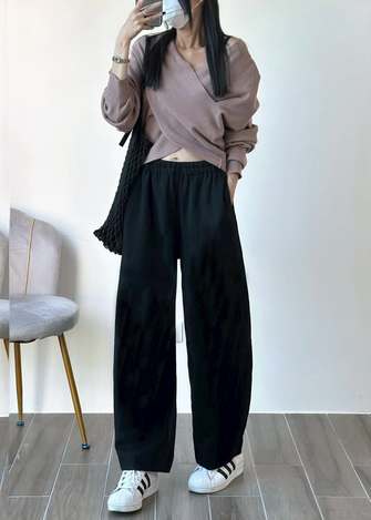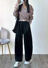 它不是一般的寬褲!它在膝蓋處做了微微的立體弧度,穿起來褲管會呈現自然的垂墜感。這個設計能巧妙地把腿部線條拉直,不管妳原本是什麼腿型,穿上它,視覺上就是又直又順!