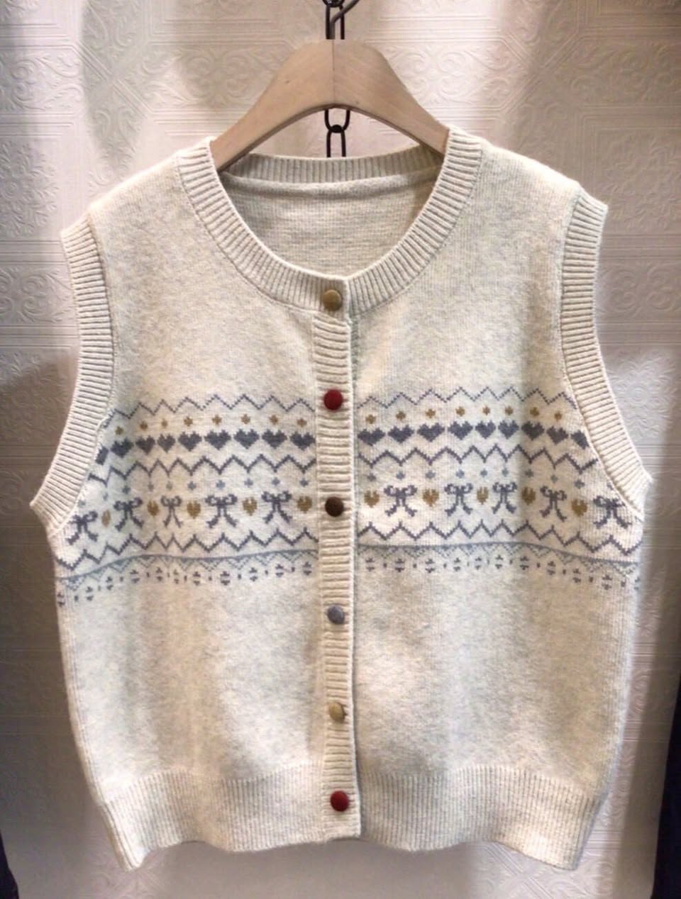 這件背心的幾何花紋非常精緻,中間還藏著可愛的愛心與蝴蝶結元素,細節感滿分。最吸引人的是那一排彩色跳色扣子,為低調的配色增添了一點小調皮,讓妳穿上它時,心情也跟著明亮起來。