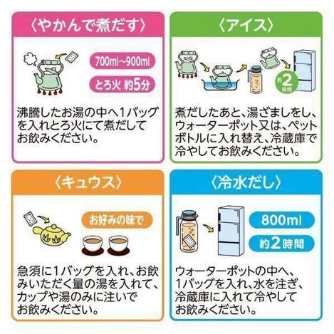 1. 取一包放入約700cc-900cc的沸水中,浸泡或煮沸5分鐘左右,1日數次飲用。